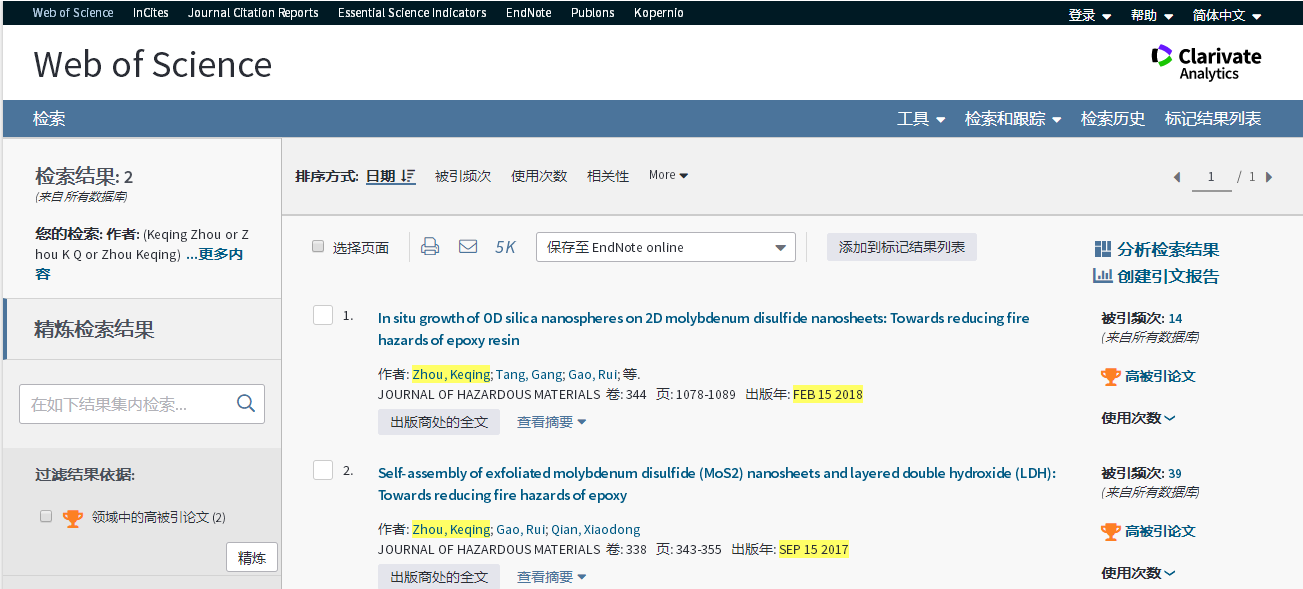 基本科学指标数据库(Essential Science Indicators,简称ESI)最新数据显示,安全工程系周克清老师发表的论文“In situ growth of 0D silica nanospheres on 2D molybdenum disulfide nanosheets: Towards reducing fire hazards of epoxy resin”入选高被引论文。该论文是周克清老师以中国地质大学(武汉)九游(中国)为第一单位、第一作者和通讯作者身份发表的第2篇ESI高被引论文。2018年7月周克清老师发表的论文“Self-assembly of exfoliated molybdenum disulfide (MoS2) nanosheets and layered double hydroxide (LDH): Towards reducing fire hazards of epoxy”曾同时入选ESI高被引论文和热点论文。