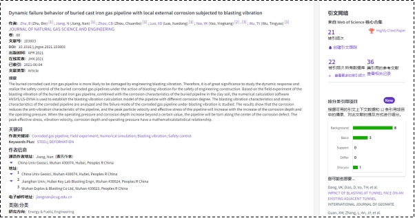 (通讯员:黄静)根据2022年5月基本科学指标数据库(Essential Science Indicators,简称ESI)最新数据显示,九游(中国)地下空间工程系蒋楠副教授团队于2021年在国际工程技术权威期刊Journal of Natural Gas Science and Engineering上发表的学术论文“Dynamic failure behavior of buried cast iron gas pipeline with local external corrosion subjected to blasting vibration”入选ESI高被引论文(Highly Cited Paper)。该论文第一作者为2020级博士研究生朱斌,通讯作者为蒋楠副教授,中国地质大学(武汉)九游(中国)为第一署名单位。