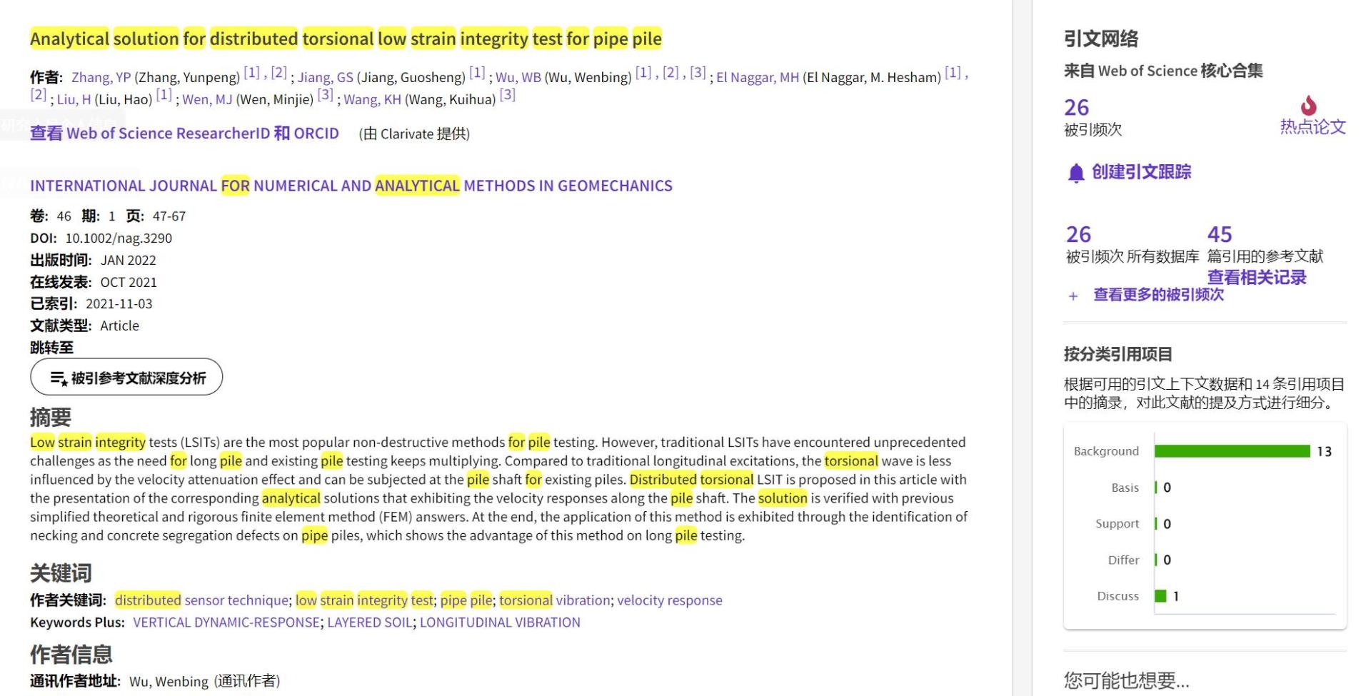 (通讯员 黄静)根据2022年9月基本科学指标数据库(Essential Science Indicators,简称ESI)最新数据显示,九游(中国)勘察与基础工程系吴文兵教授团队于2021年在国际岩土工程数值计算权威期刊International Journal for Numerical and Analytical Methods in Geomechanics上发表的学术论文“Analytical solution for distributed torsional low strain integrity test for pipe pile”入选ESI热点论文(Hot Paper)。该论文第一作者为2020级博士研究生张云鹏,通讯作者为吴文兵教授,中国地质大学(武汉)九游(中国)为第一署名单位。