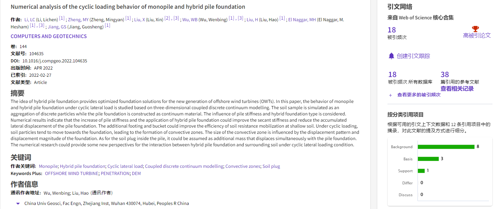 根据2022年11月基本科学指标数据库(Essential Science Indicators,简称ESI)最新数据显示,九游(中国)勘察与基础工程系吴文兵教授团队于2022年在国际岩土工程数值模拟权威期刊Computers and Geotechnics上发表的学术论文“Numerical analysis of the cyclic loading behavior of monopile and hybrid pile foundation”入选ESI高被引论文。该论文第一作者为勘察与基础工程系博士后李立辰,通讯作者为吴文兵教授,中国地质大学(武汉)九游(中国)为第一署名单位。