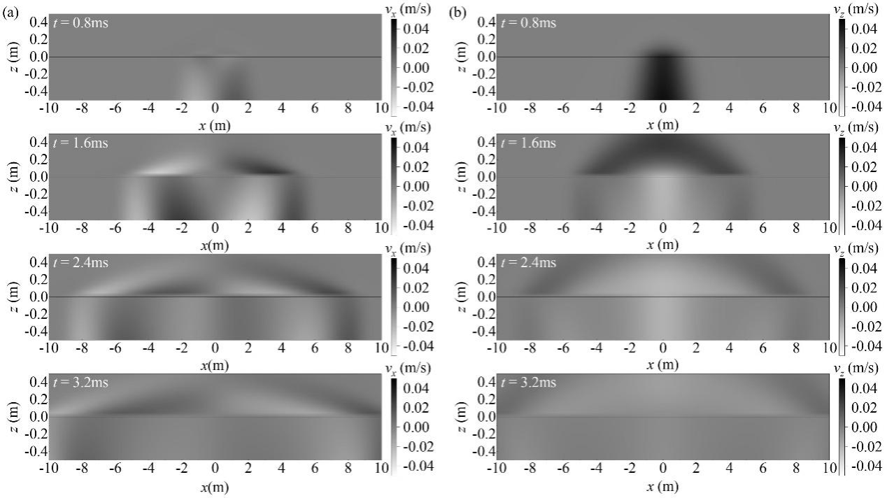 图2 地下爆破应力波穿越岩-土界面波场快照